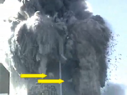 As to these ejections appearing only after the collapse initiation, it should be noted that the North Tower's antenna dropped before any other building movement is seen, which is evidence that demolition devices were working on the core before any squibs were seen emerging out of the perimeter walls. There is also video showing that some of these ejections occurred even before the collapses began. See "Visible Explosion at World Trade Center" and "WTC1 collapse initiation - visible signs." Close examination of network video shows clusters of horizontal ejections racing down the North Tower, at times accelerating faster than debris is falling outside the building | |